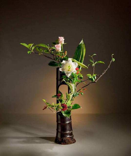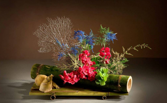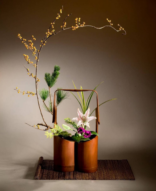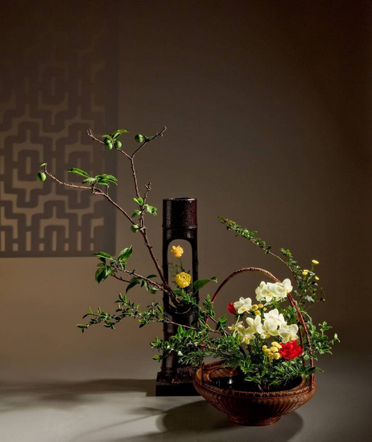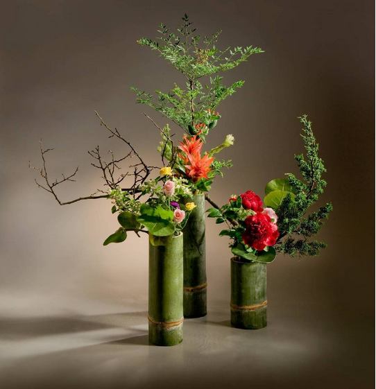 松竹梅素有“岁寒三友”之称,这三种植物在寒冬时节仍可保持顽强的生命力而得名,是中国传统文化中高尚人格的象征。其中“未出土前便有节,待到凌云仍虚心”,竹子是形容人气节高尚,不屈不挠。坚硬的竹子和艳丽的花朵搭配却有一种清素淡雅之感。竹筒插花兴起于五代,《清异录》载:“(南唐后主李煜)每春盛时,梁栋窗壁,柱拱阶砌,并做隔筒,密插杂花,榜曰‘锦洞天’”。从这段记载可见那时古人就已经采用层生的插花形式(有两个以上的节,在每节的中部开洞插上花材),其他常见形式还有单筒和船生(横卧)。