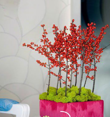 氛围:红果冬青可以入药,应和节日气氛的红色小浆果用来装点居室,欢快、喜庆,有着传统的风雅韵味。驯鹿苔的颜色与粉色面料形成视觉上的反差,很适合中国年。