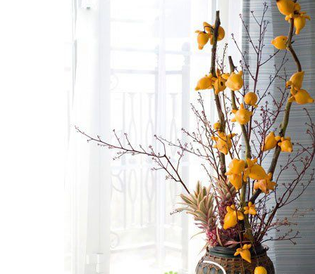 氛围:牛头茄倒挂的果实与名字十分吻合,热闹讨喜,养眼的金黄色有着很好的寓意,尤其适合需要好彩头的节日,既别致又美好。牛头茄不耐寒,冬季应摆放在温度适宜的室内欣赏。
