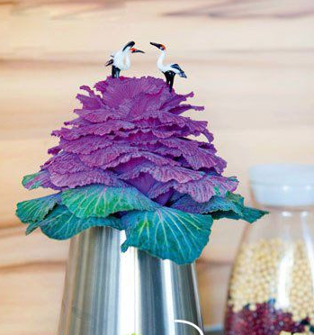 制作过程:叶牡丹也叫绿色甘蓝,原产地中海至小亚细亚一带。将叶牡丹的花叶向下翻转,有如一朵大大的甘蓝花,置于椭圆形不锈钢容器内,其上用两只仙鹤摆件装饰。