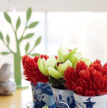 制作过程:选取花型整齐的大红色鸡冠花花冠,与淡黄色蕙兰组合造型,分别插在花泥中,并搭配三个粗瓷的青花瓷器,花器上的图案清雅有趣,与花朵在色彩上形成反差,很有中国年的喜庆韵味。