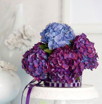 制作过程:用两种不同颜色的丝带围绕透明玻璃花器进行交插编织,并留出一小段丝带自然垂落在一边。这样,普通的花器看上去更加华美精致,丝带的颜色应选择与绣球花气质相吻合的,如紫色与银色的搭配。将绣球花扎成束,保留一些椭圆形枝叶,可与花器一同放置在白瓷蛋糕托之上,漂亮又富有新意。