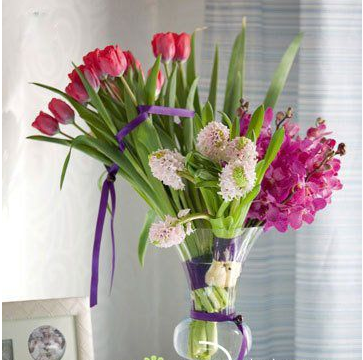 制作过程:郁金香、风信子和万化兰都是浪漫的化身,在同一色系中选择不同深浅颜色的配搭,并把花枝修剪成三种长短不同的长度,进行错落的摆放,相互衬托,又各有风情。花束和透明花器都用紫色丝带进行缠绕装饰,营造高雅的情致。