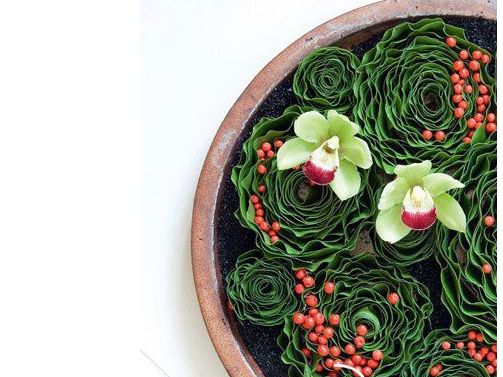 氛围:山葵叶天然的波浪边缘,逐圈围合在一起可以轻松做出花瓣造型,红豆和蕙兰是细节上的巧思,我们可以叫它梦中睡莲。因为适合俯视观赏,适合摆放在餐桌或客厅的茶几前,都不会阻碍人们的视线,影响交谈。