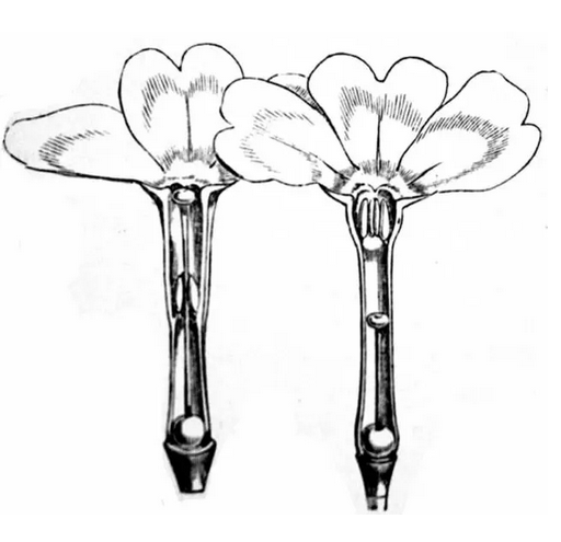 达尔文对“花柱异长”的图画描述。在腔内,像一根大头针的是雌蕊,那好几瓣像药一样的是雄蕊。可以看到,两种花的雄蕊和雌蕊长度并不一样,而且它们的长短是互补的。图片来源:达尔文1862年发表的论文